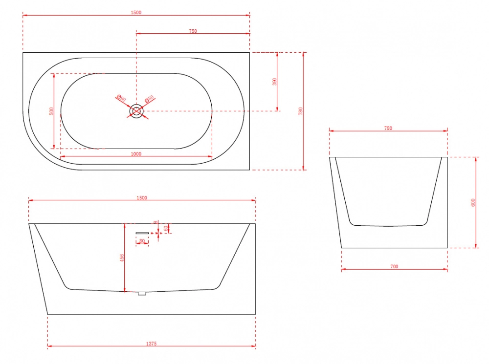 - Размер ванны (ШхВхД): 78х60х150 см.