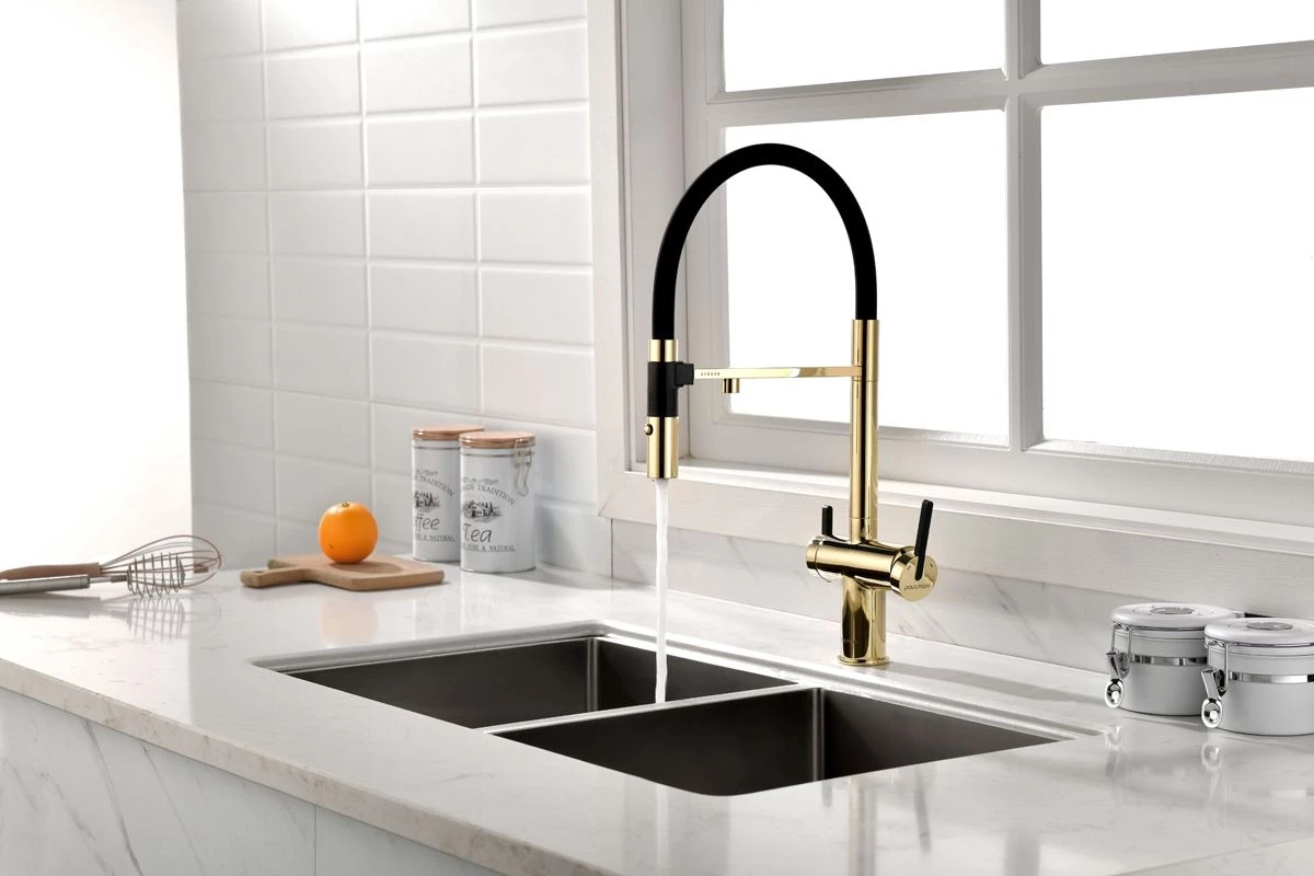 Смеситель для кухни Paulmark Siegen Si213111-BG, с подключением к фильтру, цвет брашированное золото \ черный