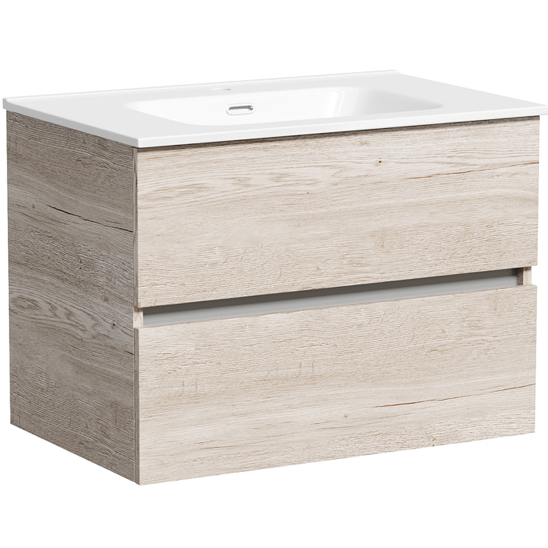 Тумба подвесная Urban c двумя ящиками оснащенными доводчиками скрытого монтажа с системой плавного закрывания, а также с ручкой Gola по всей длине тумбы. Каркас тумбы и фасад выполнен из ЛДСП в цвете Дуб галифакс натуральный.